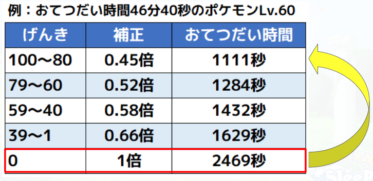 げんき回復系のメインスキルは、げんきが少ない区間を減らして、げんきがある状態のおてつだいスピード上昇により実質のお手伝い回数を増やしています。