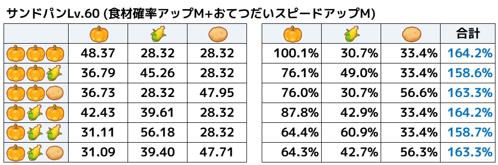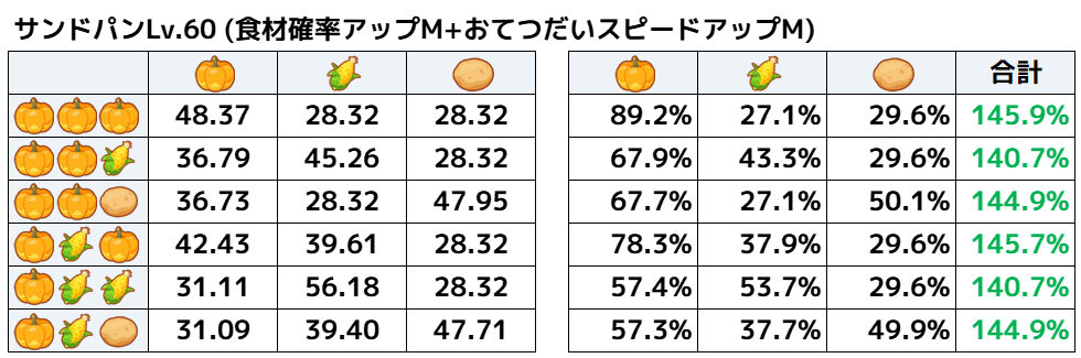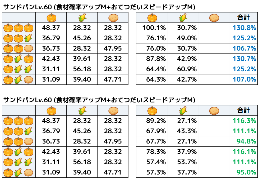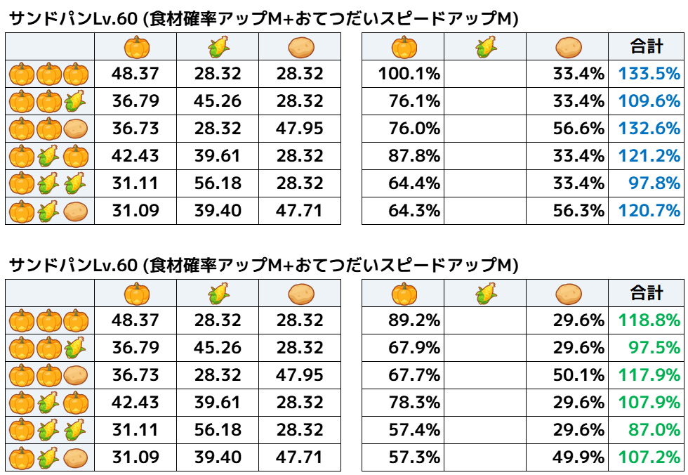 ということで、食材とくいにも「おてつだいスピードアップM」をつけて計算してみます。