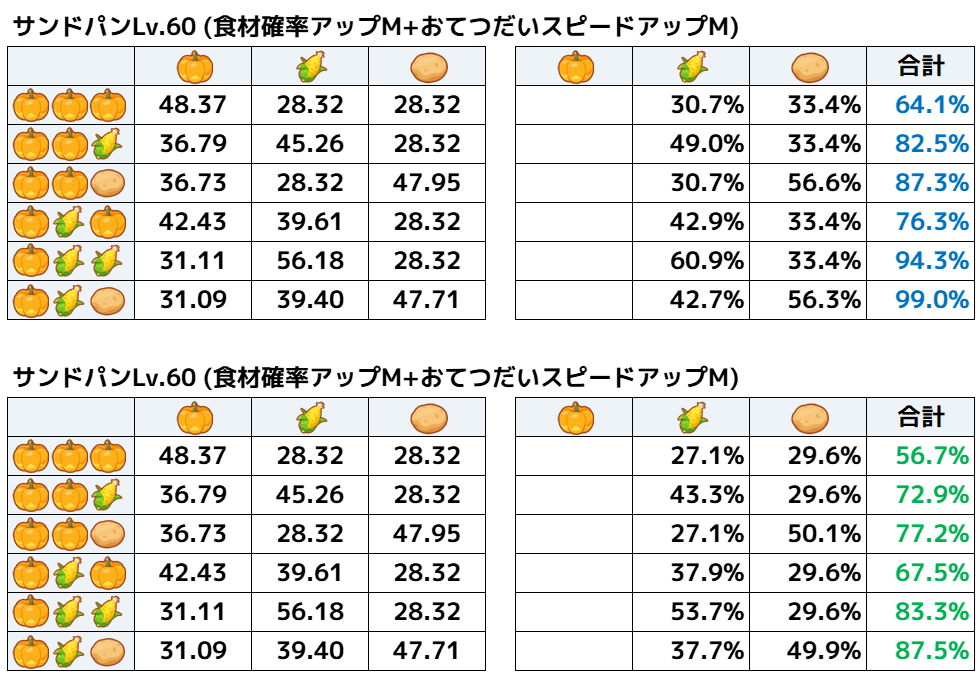 ただし、食材とくいのサブスキルが「食材確率アップM」のみに比べて、サンドパンは「スキル確率アップM」に加えて「おてつだいスピードアップM」もつけているのは少しずるい気がしてきました。