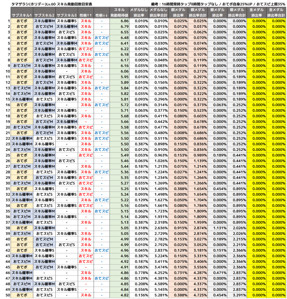 以下の表でスキル発動回数と排出率を確認し、自分が頑張れる範囲で採用基準を決めるのがおすすめです。